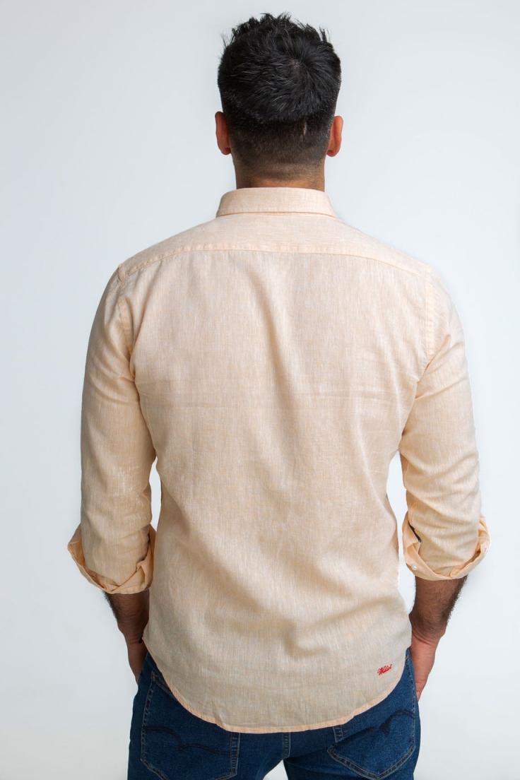 Camisa de linocon Algodón suavizado. Detalles en Cosido de Botones Inferiores en Hilo Marino y Rojo. Bordados a Contraste. El modelo mide 180cm y usa talla M. Custom Fit.