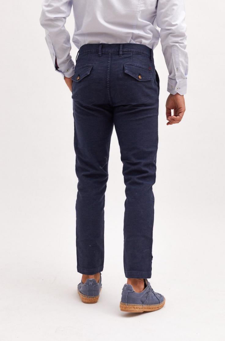 Pantalón elaborado con tejido con Estructura Granular suavizada. Cierre mediante Prolonga, con detalle de Pinzas. Bolsillos traseros con Tapetas. Largo hasta tobillo con cierre mediante Botones con Detalle colores en Hilo. 98% Algodón 2% Elastano.